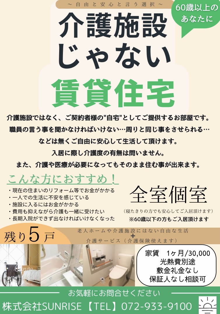 従来の介護施設とは違い各部屋ごとに賃貸としてご入居して頂き、介護が必要の方は訪問介護をご利用いただけます。金額面の負担が少なく「個人の自由」で「縛られない」そして「安心して」日々の生活を送って頂けるよう、始めたサービスです。